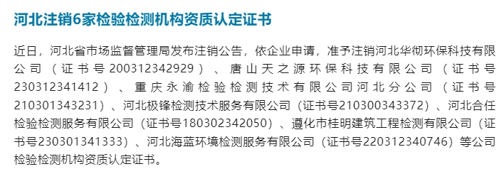近日,河北、江蘇、寧夏、貴州等地等地發(fā)布通告,注銷多家檢驗檢測機構資質認定證書。其中河北注銷6家檢驗檢測機構資質認定證書,江蘇注銷26家檢驗檢測機構資質認定證書,寧夏注銷6