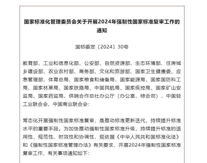 近日,國家標準委發(fā)布關于開展2024年強制性國家標準復審工作的通知。截至2024年底,實施滿5年或距上次復審滿5年的強制性國家標準,納入本次復審范圍,已下達修訂計劃或已提出修訂項