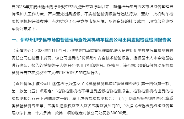 自2023年開展檢驗檢測行業(yè)規(guī)范整治提升專項行動以來,新疆維吾爾自治區(qū)市場監(jiān)督管理局持續(xù)加大工作力度,嚴肅查處出具虛假、不實檢驗檢測報告等違法行為,查辦一批機動車檢驗檢測