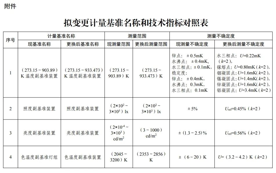 根據(jù)《計量基準管理辦法》有關規(guī)定,擬對中國測試技術研究院申請的(273.15~903.89)K溫度副基準裝置等8項國家計量基準名稱和技術指標進行變更,現(xiàn)予以公示(具體內容見附件)。公示截