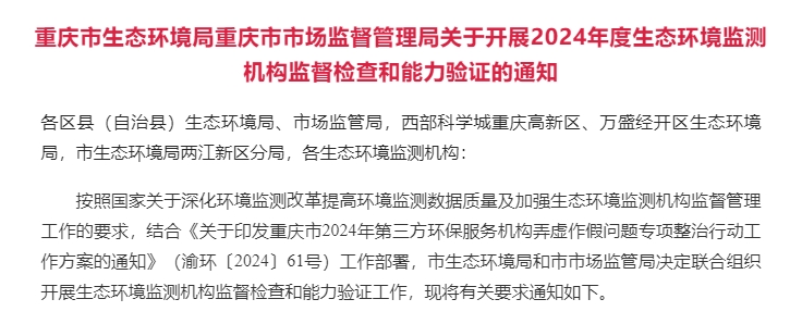 近日,重慶市生態(tài)環(huán)境局、重慶市市場監(jiān)督管理局發(fā)布通知,決定聯(lián)合組織開展生態(tài)環(huán)境監(jiān)測機構監(jiān)督檢查和能力驗證工作。通知要求,全面倒查近2年相關檢驗檢測報告,嚴厲打擊未經(jīng)檢