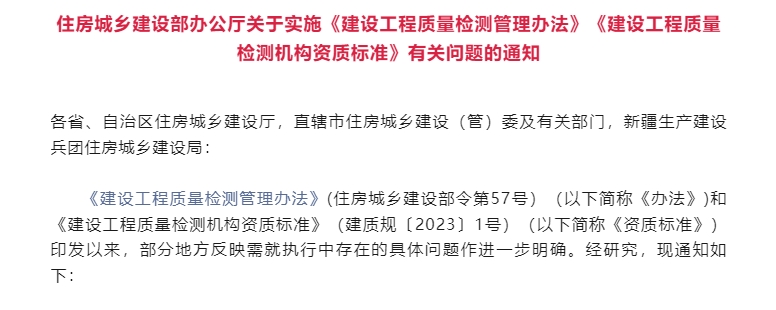 7月29日,住房城鄉(xiāng)建設部官網(wǎng)發(fā)布關于實施《建設工程質量檢測管理辦法》《建設工程質量檢測機構資質標準》有關問題的通知,明確了建設工程質量檢測機構資質管理、檢測活動管理