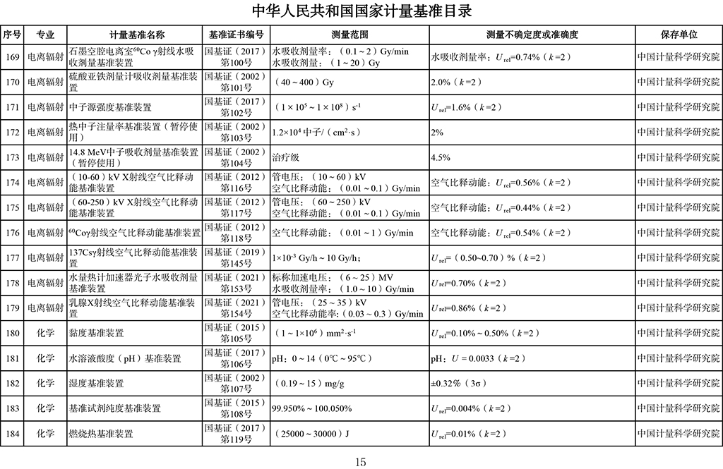 近日,國(guó)家市場(chǎng)監(jiān)督管理總局計(jì)量司發(fā)布了最新中華人民共和國(guó)國(guó)家計(jì)量基準(zhǔn)目錄,包含計(jì)量基準(zhǔn)185個(gè)。具體信息如目錄所示: