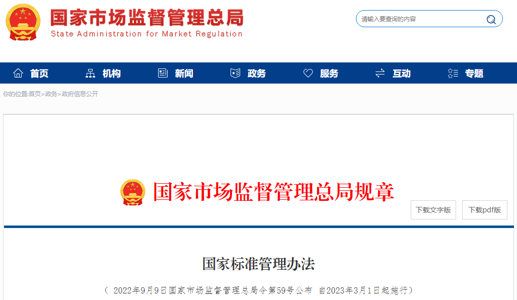 國(guó)家標(biāo)準(zhǔn)管理辦法(2022年9月9日國(guó)家市場(chǎng)監(jiān)督管理總局令第59號(hào)公布 自2023年3月1日起施行)第一章 總則第一條 為了加強(qiáng)國(guó)家標(biāo)準(zhǔn)管理,規(guī)范國(guó)家標(biāo)準(zhǔn)制定、實(shí)施和監(jiān)督,根據(jù)《中華人