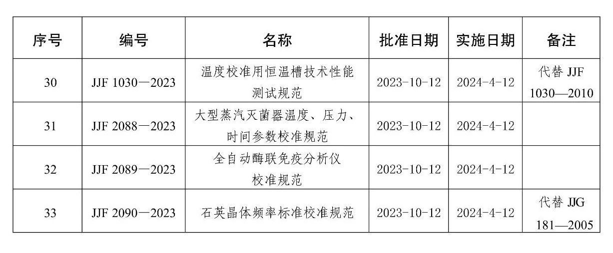 根據(jù)市場監(jiān)管總局2023年第12號公告(市場監(jiān)管總局關(guān)于發(fā)布《工作玻璃浮計(jì)檢定規(guī)程》等31項(xiàng)國家計(jì)量技術(shù)規(guī)范的公告),自9月15日起,JJF1033-2023《計(jì)量標(biāo)準(zhǔn)考核規(guī)范》等31項(xiàng)國家計(jì)