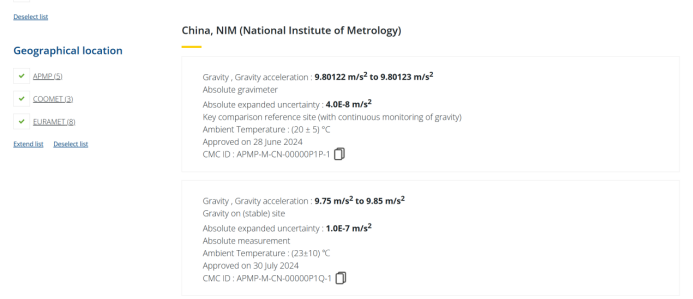 日前,中國計(jì)量科學(xué)研究院(以下簡稱“中國計(jì)量院”)兩項(xiàng)重力加速度領(lǐng)域的校準(zhǔn)測量能力(CMC)通過國際評審,相關(guān)結(jié)果在國際計(jì)量局(BIPM)官網(wǎng)正式發(fā)布。標(biāo)志著中國計(jì)量院重力加速度校準(zhǔn)測量能力首次獲得國際互認(rèn),將為全球重力數(shù)據(jù)用戶提供精準(zhǔn)重力計(jì)量服務(wù)。
