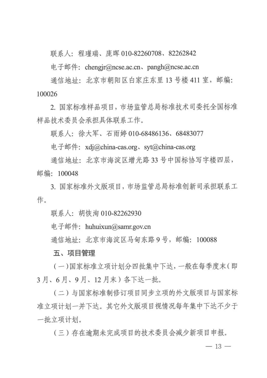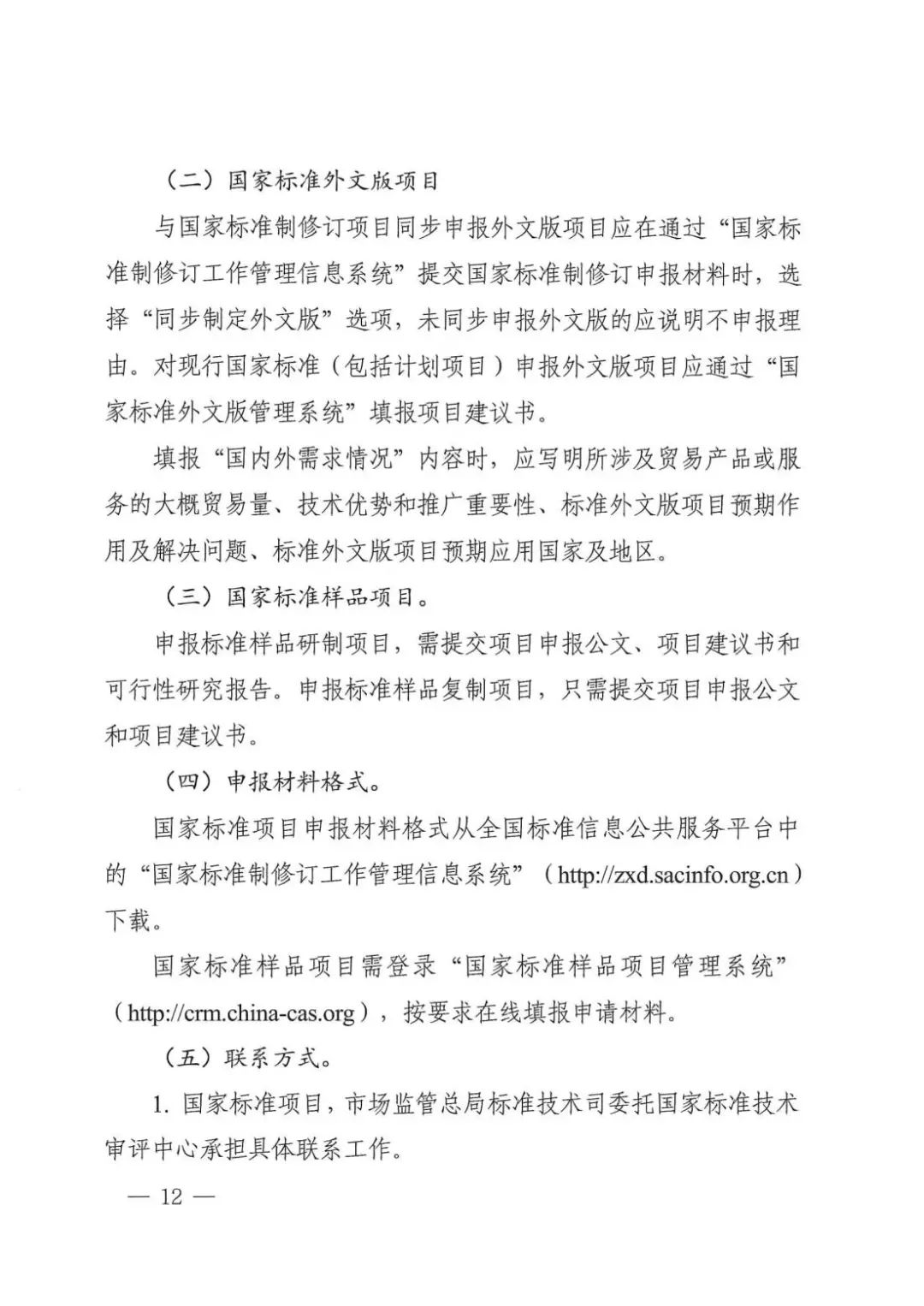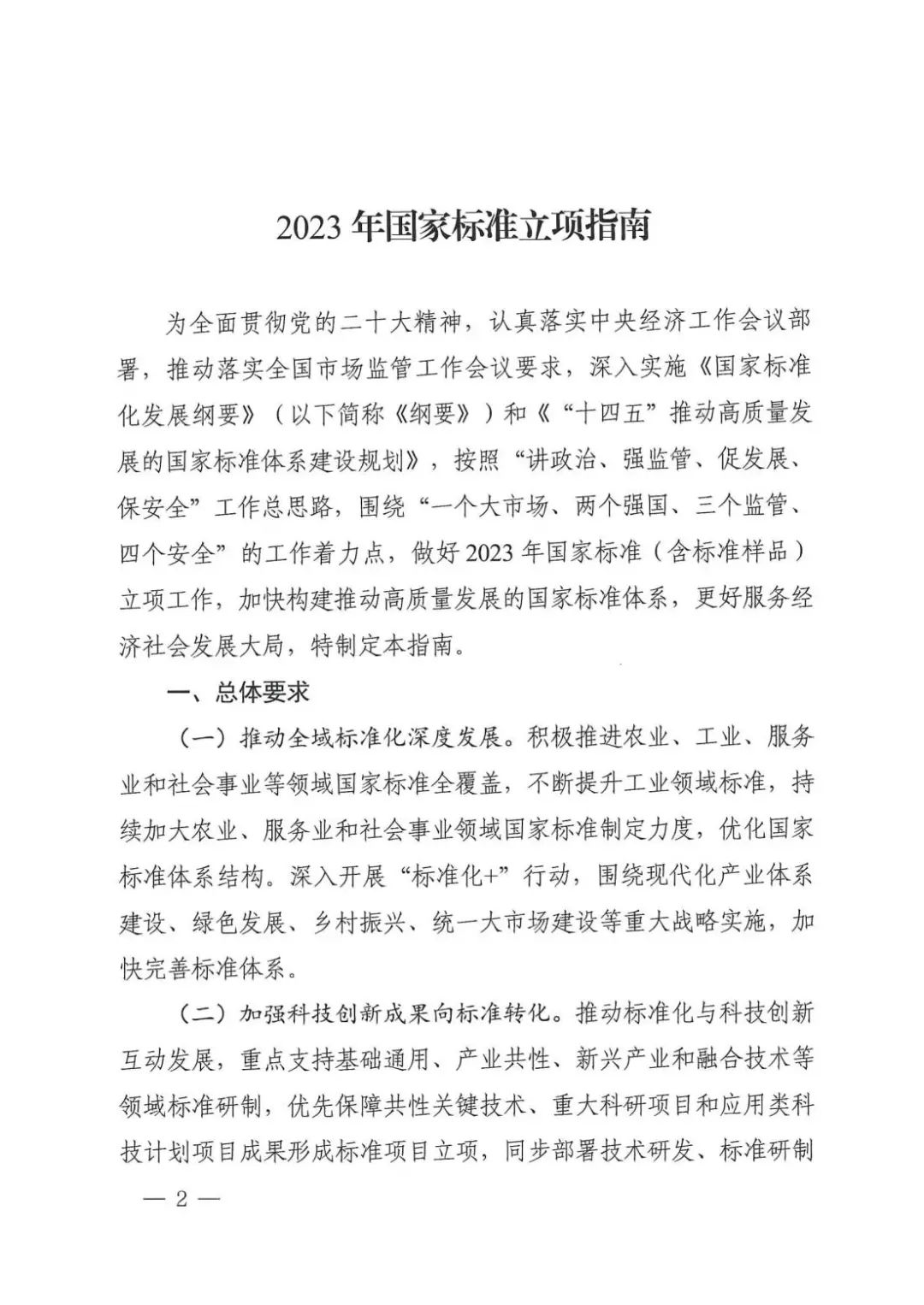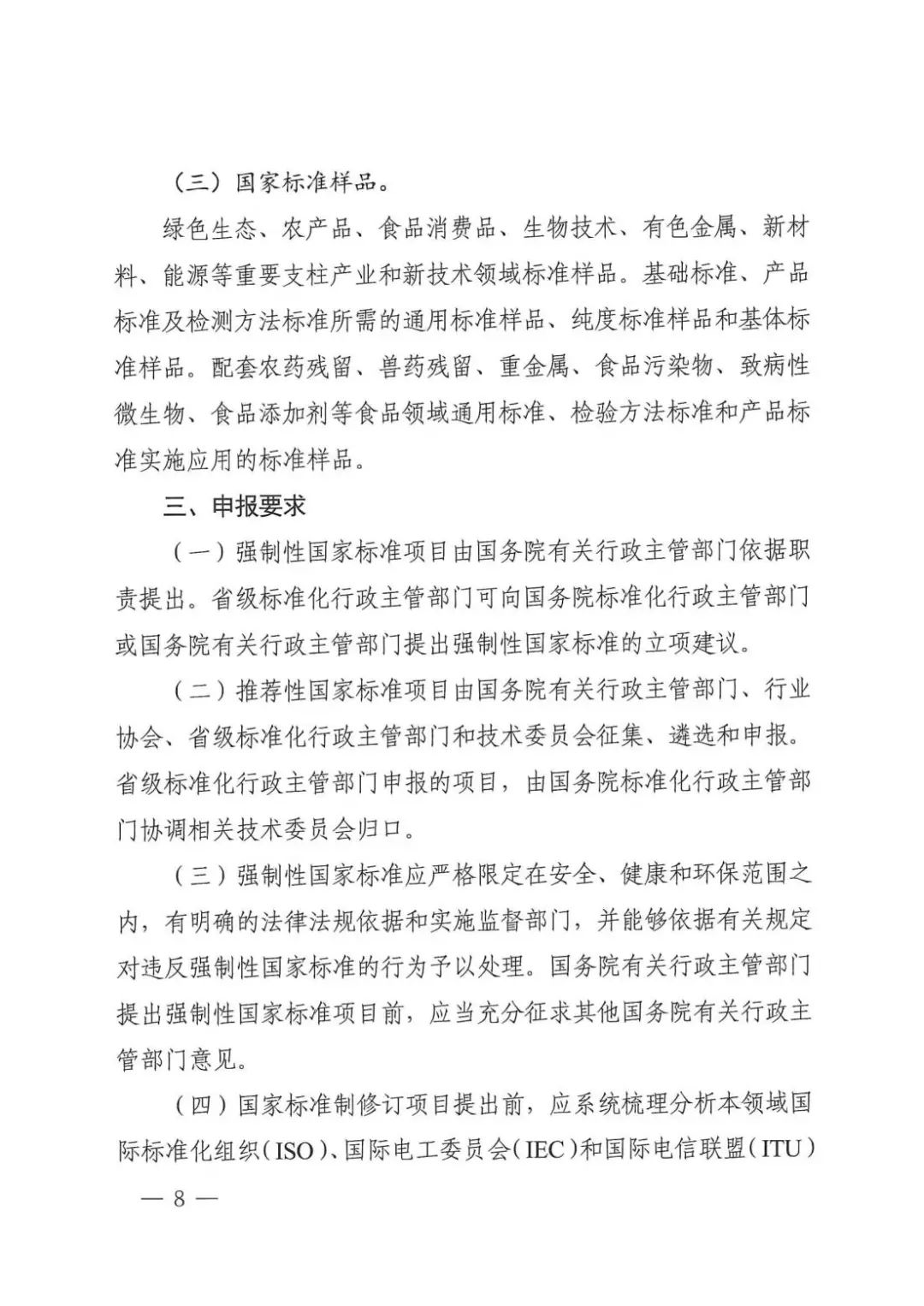 近日,國(guó)家標(biāo)準(zhǔn)委發(fā)布《2023年國(guó)家標(biāo)準(zhǔn)立項(xiàng)指南》,明確了強(qiáng)制性國(guó)家標(biāo)準(zhǔn)、推薦性國(guó)家標(biāo)準(zhǔn)和國(guó)家標(biāo)準(zhǔn)樣品重點(diǎn)立項(xiàng)領(lǐng)域,對(duì)申報(bào)要求和材料做了具體要求,詳情如下: