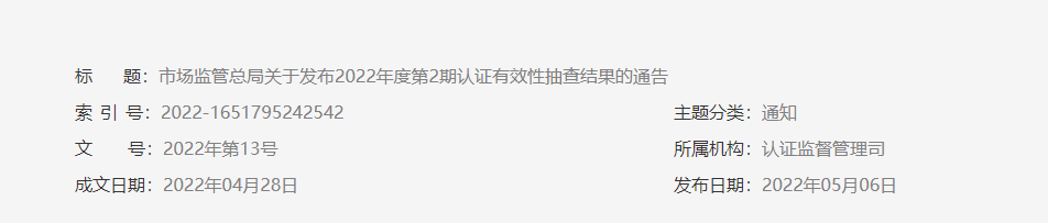 國家市場監(jiān)督管理總局通 告2022年第13號(hào) 市場監(jiān)管總局關(guān)于發(fā)布2022年度第2期認(rèn)證有效性抽查結(jié)果的通告 為監(jiān)測認(rèn)證活動(dòng)相關(guān)方的工作質(zhì)量,推動(dòng)認(rèn)證有效性和公信力的提