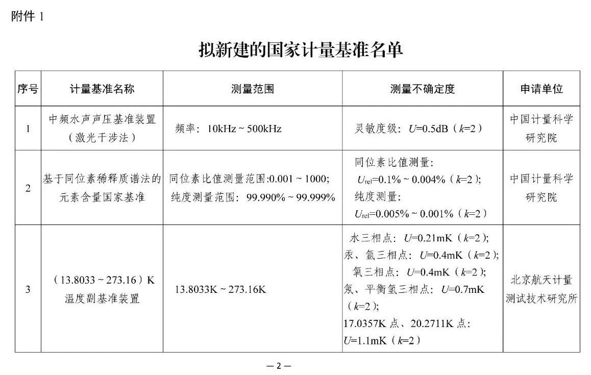 1月2日,市場(chǎng)監(jiān)管總局發(fā)布公示信息,擬批準(zhǔn)新建“中頻水聲聲壓基準(zhǔn)裝置(激光干涉法)”等8項(xiàng)國(guó)家計(jì)量基準(zhǔn),以及提升“(15~300)J沖擊能基準(zhǔn)裝置”技術(shù)能力,公示截止
