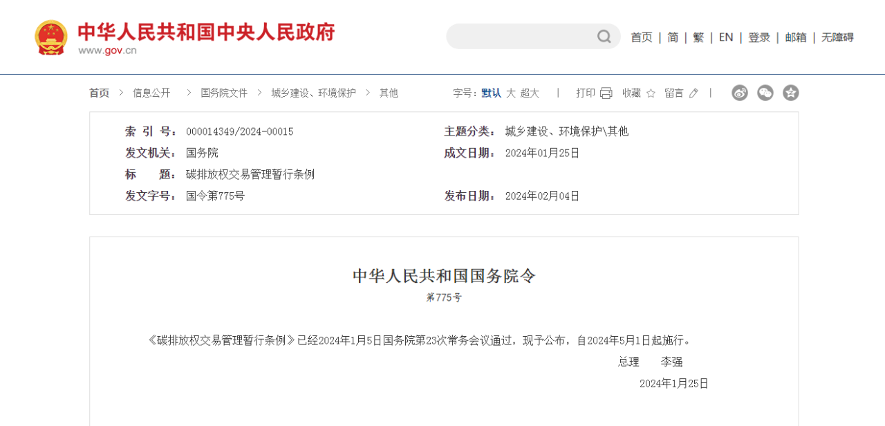 《碳排放權(quán)交易管理暫行條例》(以下簡(jiǎn)稱《條例》)于2024年1月5日國(guó)務(wù)院第23次常務(wù)會(huì)議通過(guò),現(xiàn)予公布,自2024年5月1日起施行?!稐l例》規(guī)定,重點(diǎn)排放單位應(yīng)當(dāng)采取有效措施控制溫