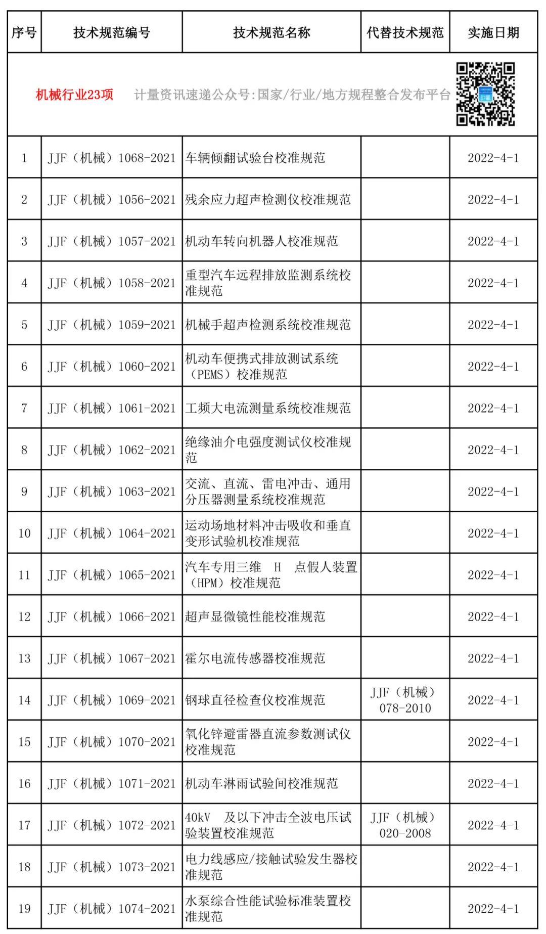 根據(jù)市場監(jiān)管總局2022年第12號公告,JJG159-2022《雙活塞式壓力真空計檢定規(guī)程》等20項國家計量技術(shù)規(guī)范將于10月29日正式實施,其中替代8項?!峨p活塞式壓力真空計檢定規(guī)程》等